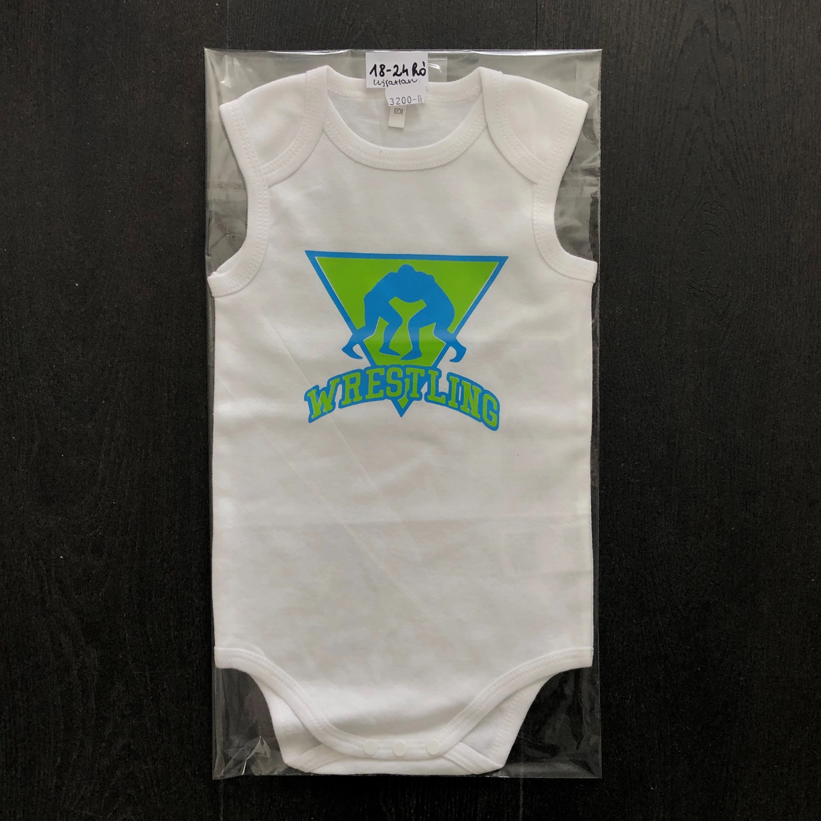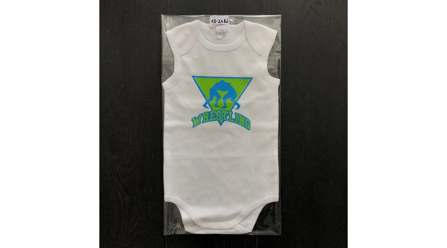 Baba-body, pamut fehér - 18-24 hó - Háromszög pajzs mintával - kék-zöld - Ujjatlan